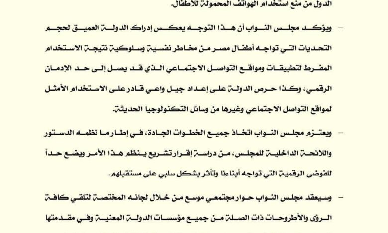 في ظل التحولات الرقمية المتسارعة التي يشهدها العالم، لم يعد استخدام الأطفال للتكنولوجيا ووسائل التواصل الاجتماعي قضية هامشية أو شأنًا أسريًا خاصًا، بل تحوّل إلى ملف مجتمعي وأمني وثقافي متكامل، يستدعي تدخل الدولة ومؤسساتها التشريعية والتنفيذية. ومن هذا المنطلق يأتي بيان مجلس النواب الذي يعلن فيه توجّه الدولة نحو إعداد مشروع قانون ينظم ضوابط استخدام الأطفال لتطبيقات ومواقع التواصل الاجتماعي، في خطوة تعكس وعيًا متزايدًا بحجم المخاطر التي تحيط بالنشء في العصر الرقمي.