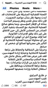 وقد أكد النقيب أن الإعلان المنشور لم يُعرض عليه قبل نشره ولم يقم بالتوقيع عليه، موضحًا أن التعديل الوارد بشأن مواعيد التصويت لا يتوافق مع القرار المعتمد من المجلس الأعلى لنقابة المهندسين، والذي حدد فترة التصويت من الساعة العاشرة صباحًا وحتى العاشرة مساءً. ويعكس هذا الموقف تمسكًا واضحًا بضرورة احترام القرارات المؤسسية الصادرة عن الجهات المختصة داخل النقابة، باعتبارها الإطار القانوني الذي ينظم العملية الانتخابية ويضمن عدالتها.