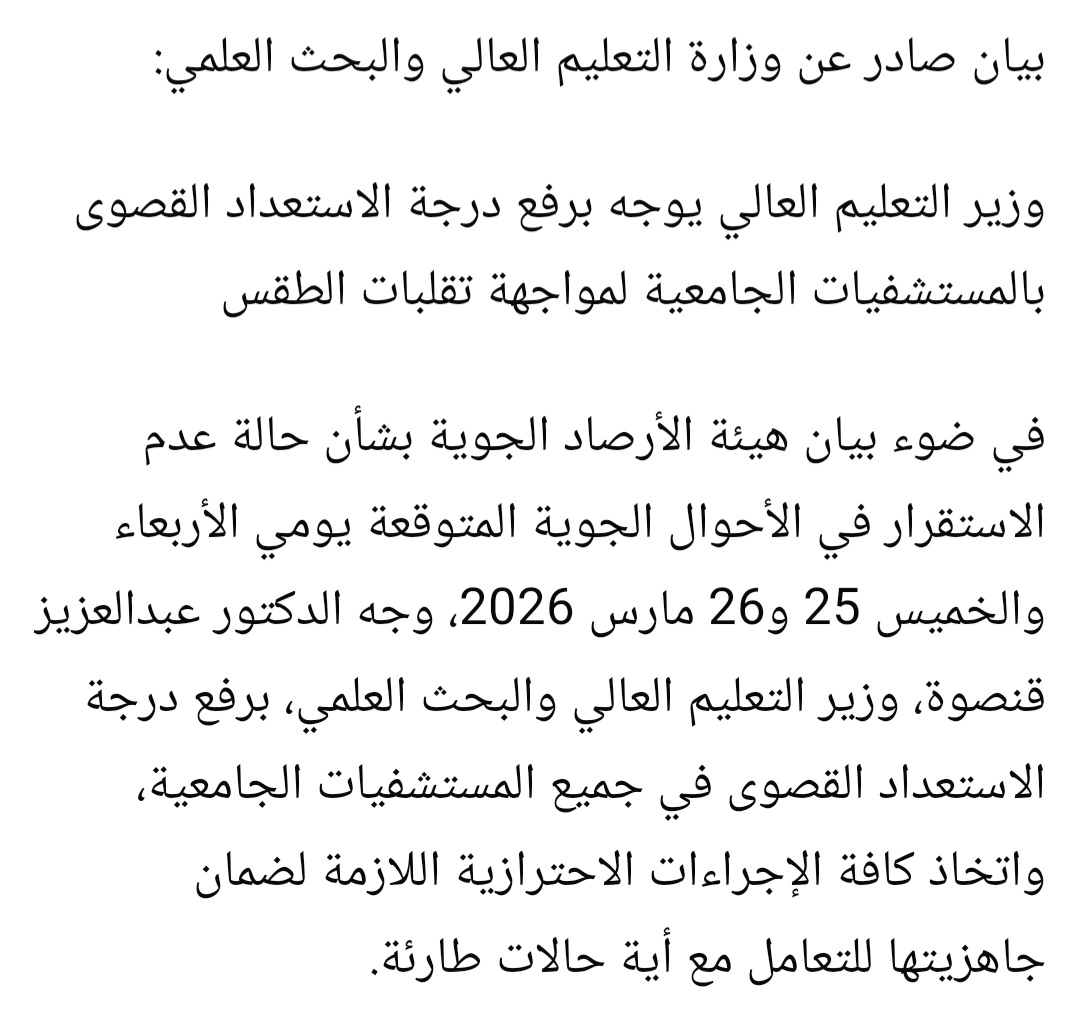 في إطار الاستعداد لموجة التقلبات الجوية المتوقعة، وجه الدكتور عبدالعزيز قنصوة وزير التعليم العالي والبحث العلمي، برفع درجة الاستعداد القصوى في جميع المستشفيات الجامعية على مستوى الجمهورية، وذلك بالتزامن مع تحذيرات الهيئة العامة للأرصاد الجوية بشأن حالة عدم الاستقرار في الأحوال الجوية يومي الأربعاء والخميس 25 و26 مارس 2026.